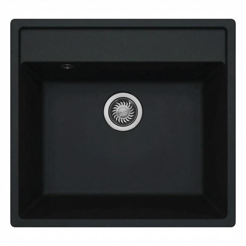 GraniteMy Bremen granieten spoelbak 53x50 cm zwart opbouw onderbouw en vlakinbouw met kraangatbank MET RVS PLUG Opbouw, onderbouw of vlakinbouw te verwerken
